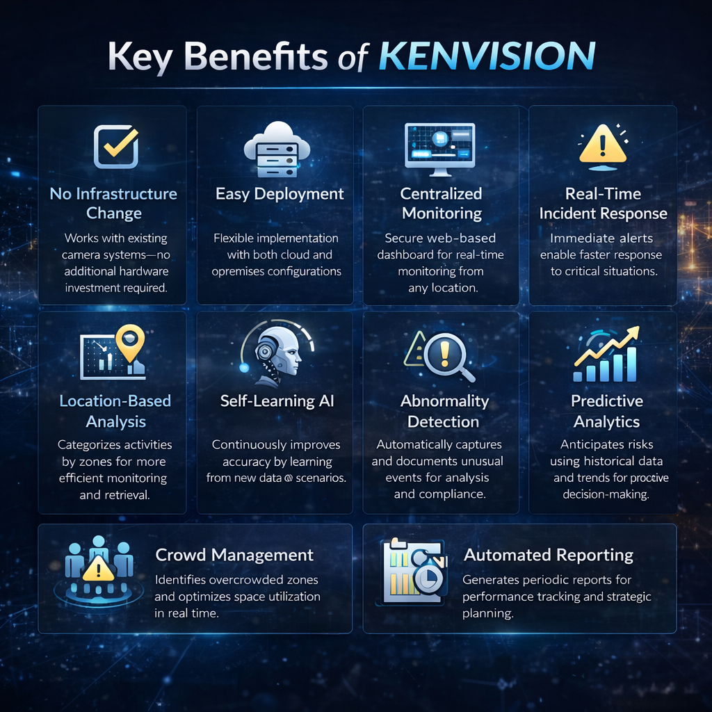 Powered by cutting-edge artificial intelligence and computer vision technologies, KENVISION analyzes live video feeds to detect events, identify anomalies, and generate actionable insights. Beyond security, it delivers comprehensive business intelligence—helping organizations optimize operations, improve safety, and enhance decision-making.