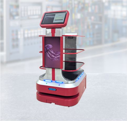 Designed for internal logistics and service operations, this AMR supports multi-zone and multi-floor delivery. It carries payloads up to 60 kg, features voice UI and touch display interfaces, uses LiDAR + camera-based SLAM navigation, operates at 1.5 m/s, and offers 10+ hours battery life for extended operations.