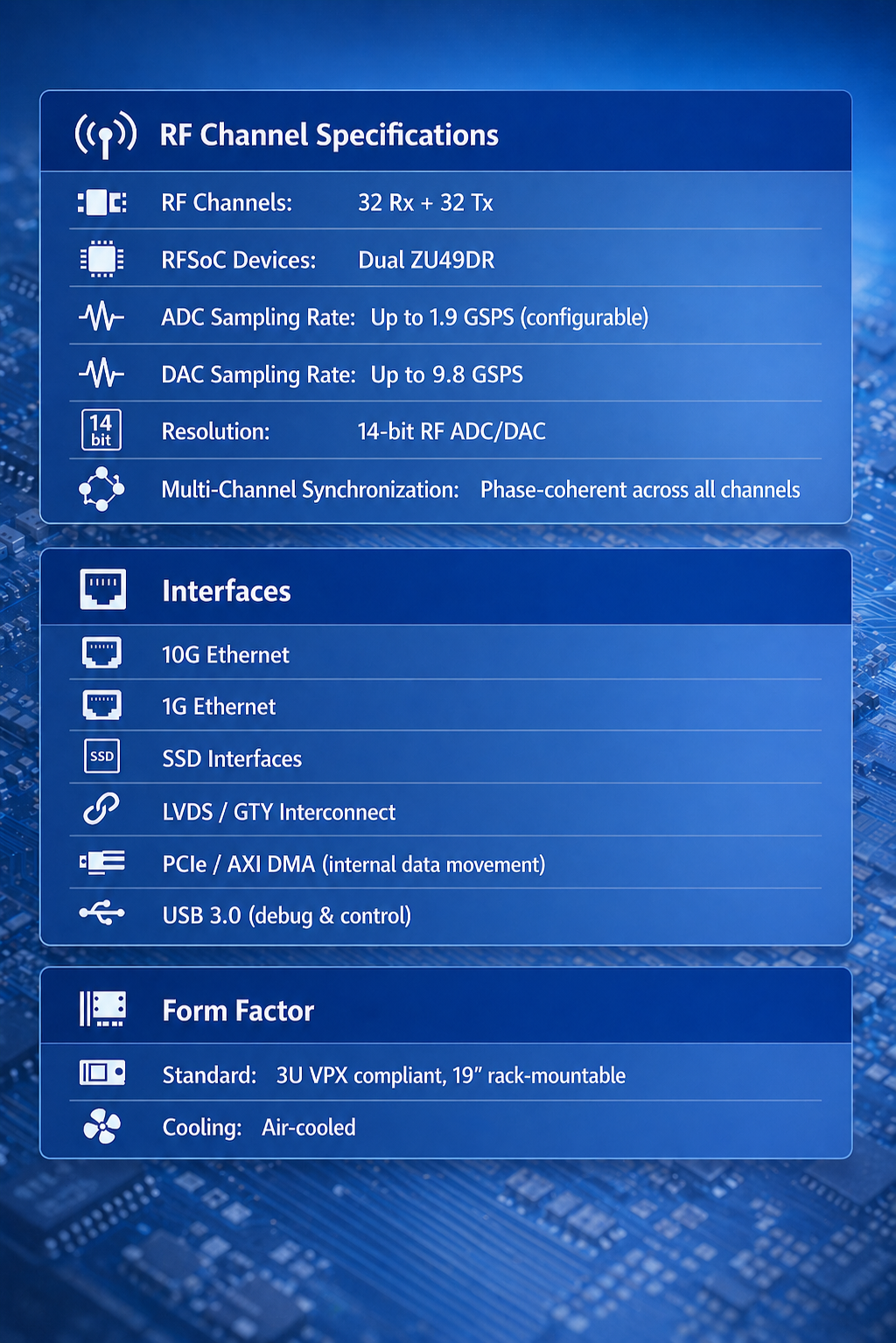The 32-Channel RF Data Acquisition & Waveform Generation System (RFSoC) by Ciyes Systems is a high-performance platform engineered for real-time RF processing and high-speed data applications. Built on advanced RFSoC architecture with a dual FPGA design on a single board, the system supports simultaneous multi-channel acquisition and transmission, featuring 32 Rx channels for high-speed data acquisition and 32 Tx channels for waveform generation, making it ideal for complex signal environments. Housed in a 19” 2U rack-mount enclosure, it integrates high-speed storage, high-capacity RAM for real-time processing, and precision clocking to ensure reliable, high-throughput performance for mission-critical applications. The platform also includes multi-SSD storage support for continuous data recording, high-speed optical interfaces with upgrade capability, Ethernet and serial connectivity for flexible integration, and an external clock input for precise synchronization, delivering a scalable and efficient solution for advanced RF systems.