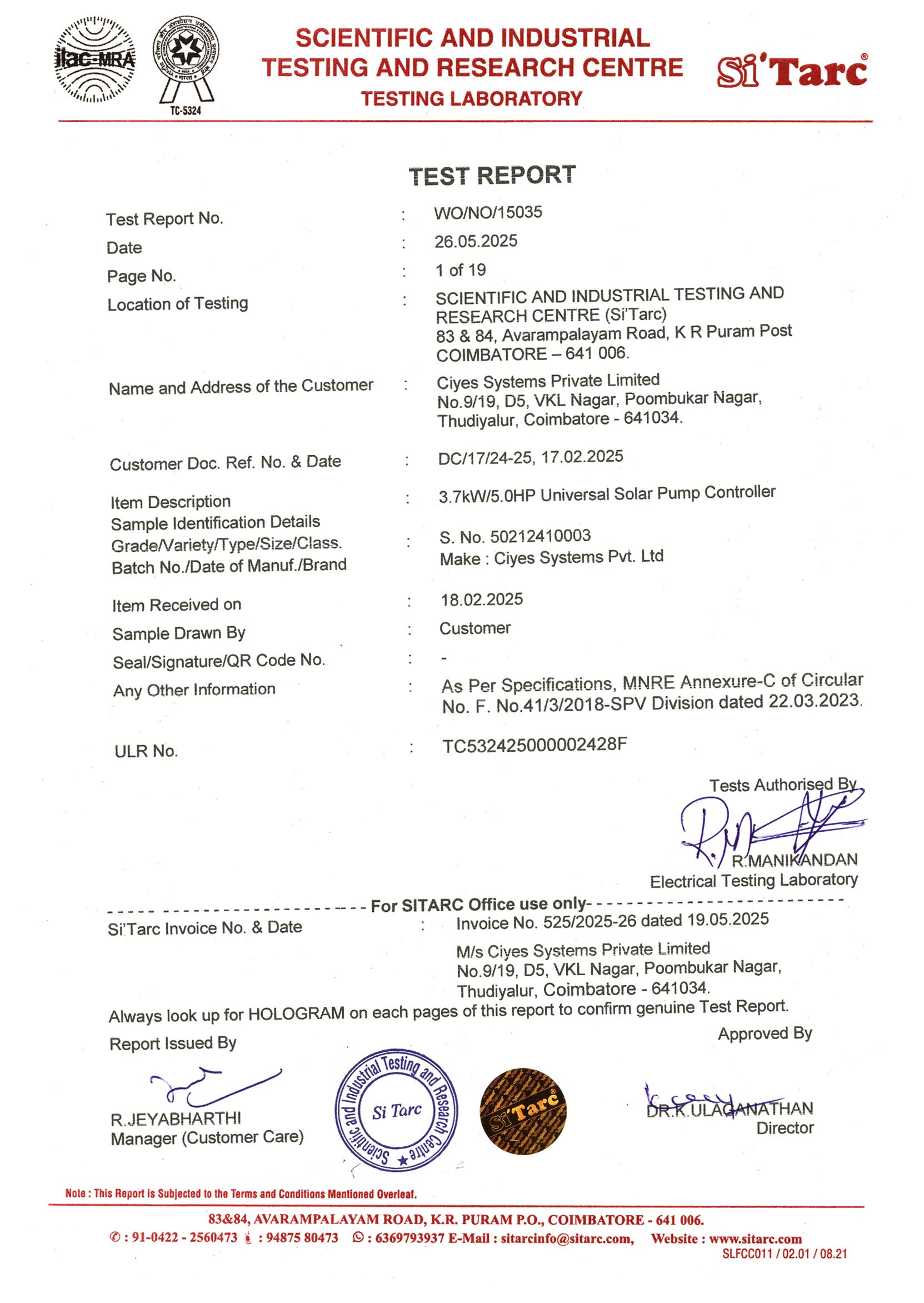At Ciyes, we deeply understand the pump industry and farming community needs. Our solar pump controllers are proudly designed and developed in India, meeting global standards for world-class performance. Combining advanced technology with strong safety features, Ciyes ensures optimal energy use, reliability, and efficient water management—delivering innovative, sustainable solutions you can trust.Designed specifically for agricultural and industrial water pumping, this controller complies fully with SECI and MNRE guidelines, ensuring eligibility under the PM-KUSUM scheme and suitability for diverse Indian conditions.